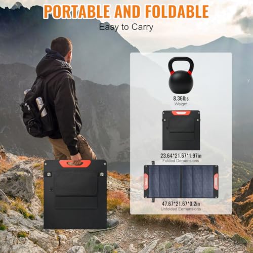 【Portable, Foldable and Easy Setup】:The travel solar panel only weighs 8.36 lbs, the folded size is 23.64*21.67*1.97 inches and it comes with a magnetic handle for easy carrying around. Equipped with 2 kickstands, the portable solar panels can be firmly placed on the ground. Within a few seconds you can easily adjust the foldable solar panel’s angle to optimize sunlight absorption and set it up to efficiently harness solar energy. Note:The 100W solar panel can’t store electricity