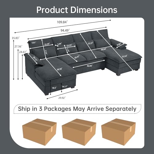 Buy with Confidence: Please note that your 4 seat sectional sofa will arrive in three separate packages, which may arrive at different times. For any questions or concerns, we are always here to help. Enjoy the excitement of assembling your 110″ u shaped cloud couch!