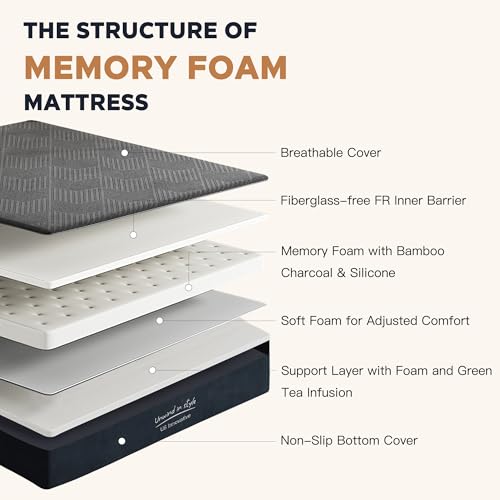 Innovative Layered Construction: Featuring a breathable cover, fiberglass-free FR inner barrier, memory foam infused with bamboo charcoal and silicone for odor control and temperature regulation, soft foam for adjusted comfort, and a support layer with foam and green tea infusion for durability.