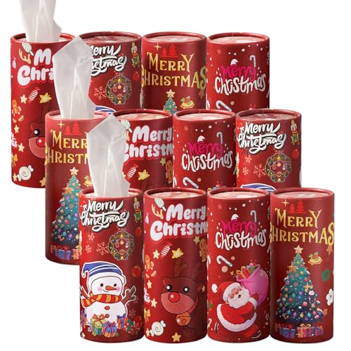 12 Pack Christmas Car Tissues, 4 Decorative Christmas Car Tissues Cylinder with Facial Tissues, Round Tube Xmas Cup Holder Tissues Boxes for Car Travel Party Bathroom