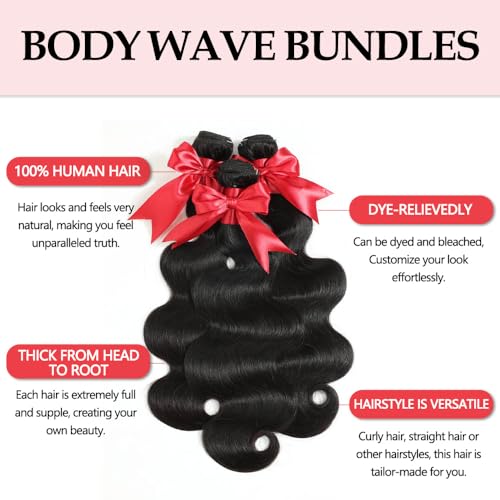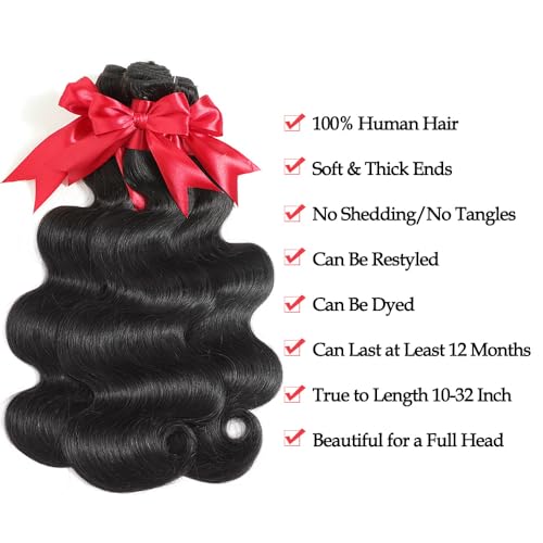 Body Wave Bundles Human Hair Feature: 1B Natural Black Color, Double Machine Weft For Hair Bundles. 10-32 Inch 3 Bundles Human Hair Available, Each Bundle Is 100 Grams, No Spilt Ends, No shedding, No tangle, True To Length, Totally Full Enough For Your Head, Keep You Pretty And Attractive
