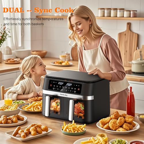 【HIGH POWER & OIL-FREE COOKING】: HoninJoy dual zones air fryer delivers fast and even cooking, reducing cooking time by up to 30%. With oil-free technology, enjoy healthier meals with up to 80% less fat compared to traditional frying methods—golden fries, juicy steaks, no compromise
