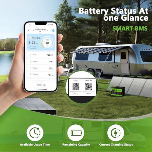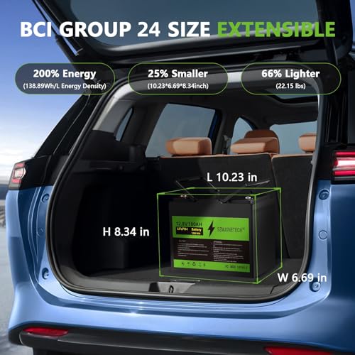 Specification: 12V 100Ah Group 24 LiFePO4 Battery with Bluetooth,Deep Cycle Lithium Battery,Built-in 100A BMS with Low-Temp Protection,Max.15000 Cycles,Perfect for RV,Solar System,Trolling Motors etc.