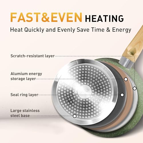𝐅𝐚𝐬𝐭 𝐄𝐯𝐞𝐧 𝐇𝐞𝐚𝐭𝐢𝐧𝐠: Experience the peace of mind with our eco-friendly pots and pans set, free of PFOS and PFOA. The superior thermal conductivity ensures even heating, allowing your food to cook uniformly. Shorter cooking times save energy and make every meal preparation efficient and eco-conscious.