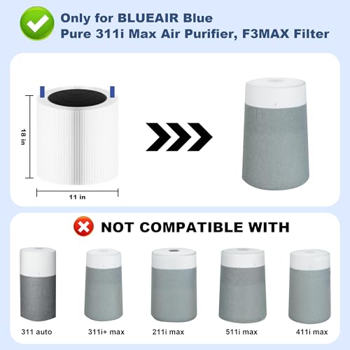 Compatibility: The 311i Max replacement filter is fully compatible with Blueair Blue Pure 311i Max Air Purifier F3max. NOT fit for Blue Pure 311i Max/ 311 Auto/ 311 (Non-Auto) air purifiers. Please confirm your machine model before order.