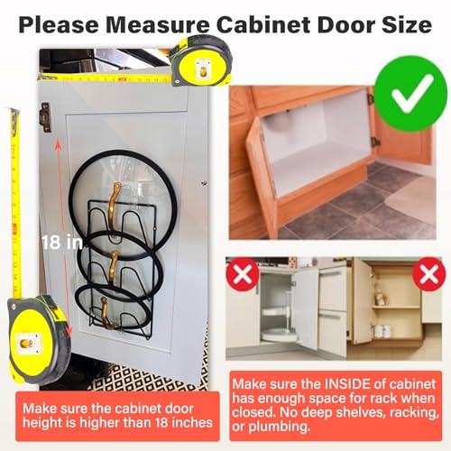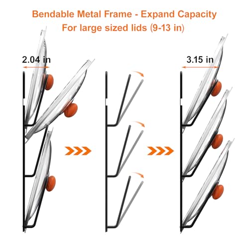NOTE: While the lid rack is bendable to fit large sized lids, but please DON’T excessively bend the lid rack to fit large pot lids, otherwise the lids rack may stick out too much and the cabinet door may not close.