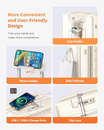 Specification: 20 IN Carry On Luggage 22x14x9 Airline Approved – Front Pocket Hardside Travel Suitcase Unbreakable -with Cup Holder,Charging Port,Side Pothook, 360°Spinner Wheels, TSA Lock-White