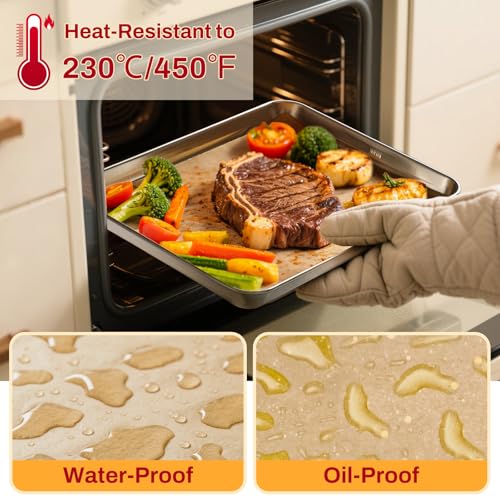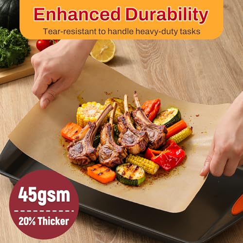 Extra Thick & Durable: 20% thicker than standard sheets, our heavy-duty parchment resists curling, tearing, and burning. Oilproof, waterproof, and heat-resistant, it won’t soak through or warp—even with dense foods like sticky dough or greasy meats.