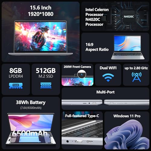Specification: 2026 Latest Laptop, 8GB RAM 512GB SSD Laptop, 15.6 inch 2K FHD Display,Celeron N4020C Processor, Thin & Portable Laptop,Dual WiFi, USB 3.0*2, BT,200W Front Webcam,Full-Featured Type-C,6500mAh Battery,