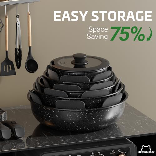 75% Space Saving: OzawaBear’s removable cookware set fits neatly in tight spaces—only 10” x 10” x 8” when stored. Free up 75% more cabinet space and enjoy the perfect solution for small kitchens, RVs, and camping trips.
