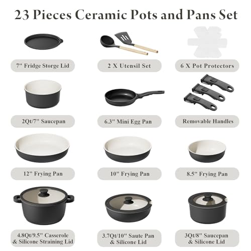 Specification: 23-Piece Removable Handle Pots and Pans Set Non Stick, Ceramic Cookware Set with Mini Egg Pan, Large Capacity, Non-Toxic, Induction & Oven Safe, Dishwasher Safe, RV Compatible, Black & White