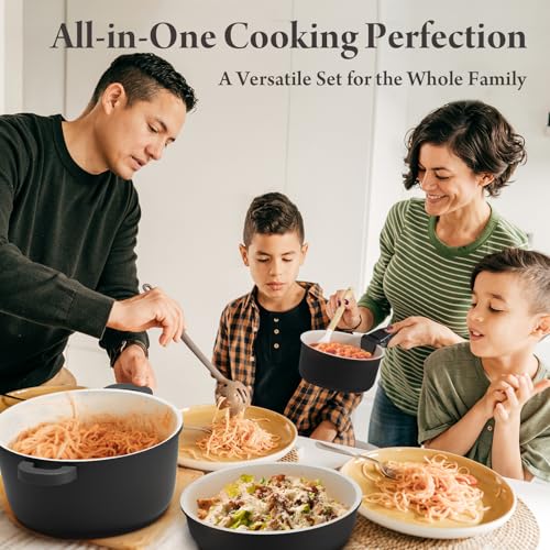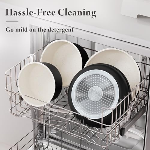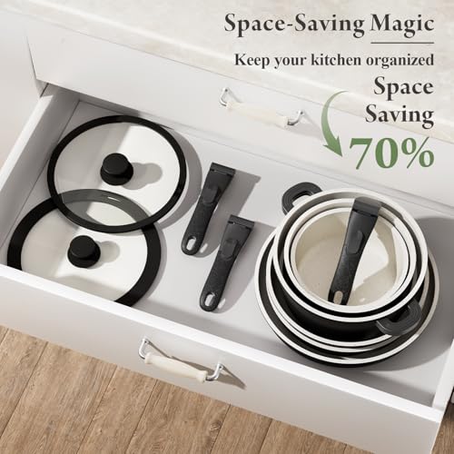 Space-Saving Design: The stackable construction of our ceramic cookware helps you save up to 70% of storage space in your kitchen. Perfect for small kitchens or anyone wanting an organized cooking area, this set keeps your pots and pans neat and easy to access.