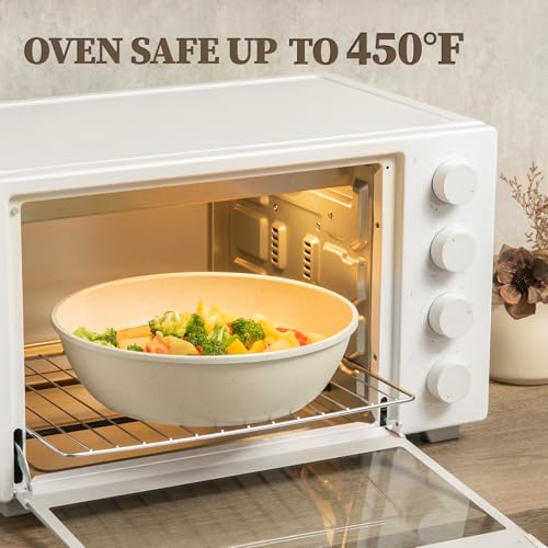 Quick & Even Heating for All Stoves- Enhanced bottom secures quick and even heating to keep you away from hot or cold spots that undermine your dish or health by leaving some food overcooked and some undercooked. A high conductive base allows our nonstick cookware to work well on all cooktops, including induction, gas, electric, ceramic stoves and also oven safe up to 450°F
