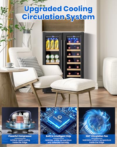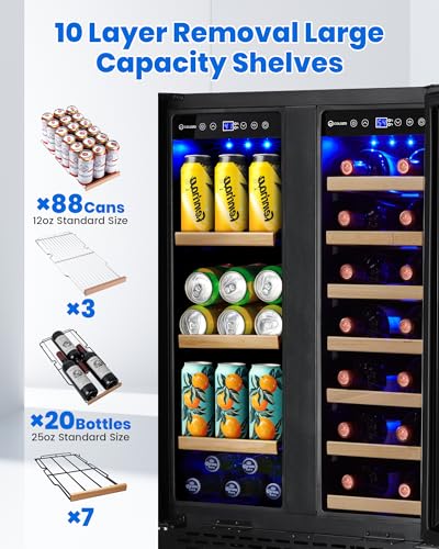 【Spacious Storage for Wine Enthusiasts 】The COLOZO 24 inch dual zone wine refrigerator with a ample capacity can hold up to 20 Bottles size of 25 oz wine and 88 cans size of 12 oz drinks.This makes it perfect for storing a diverse selection of drinks, including wine, soda, beer, and water. The 3+7 pcs removable shelves provide added convenience, allowing you to effortlessly organize and access your beverage collection with ease.