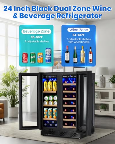 Specification: 24 Inch Wine Fridge Under Counter-Wine and Beverage Refrigerator with Glass Door&Lock, Dual Zone Black Beverage Refrigerator Holds 20 Bottles & 88 Cans for Beer/Bar/Office/Kitchen