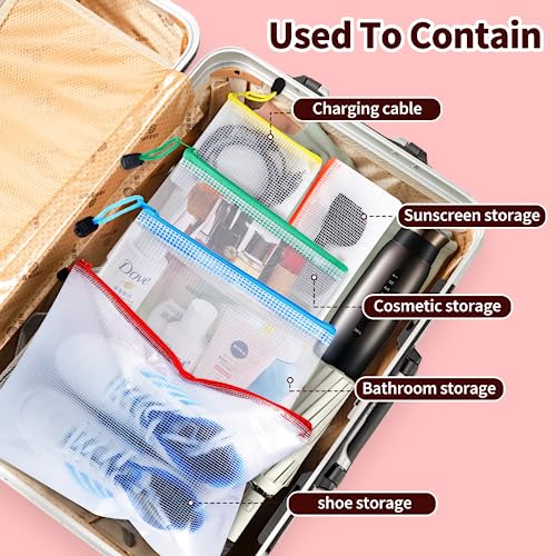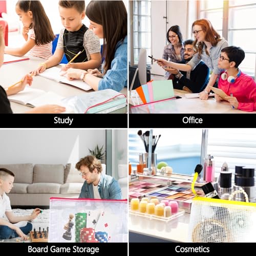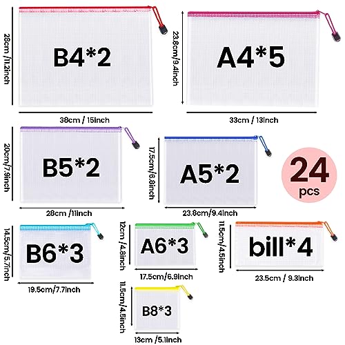 Multiple sizes:24pcs zipper organizer bags in 8 different sizes and 8 colors, 2*B4(Red), 5*A4(Rose Red), 2*B5(Purple) , 2*A5(Blue), 3*B6(Light Blue), 3*A6(Green), 4*Bills(Orange), 3*B8(Yellow), Get organized with our range of mesh zipper pouches, perfect for pencil pouches, travel pouches, clear storage bags. Available in multiple sizes, these durable and transparent plastic zipper bags will keep your belongings tidy and accessible