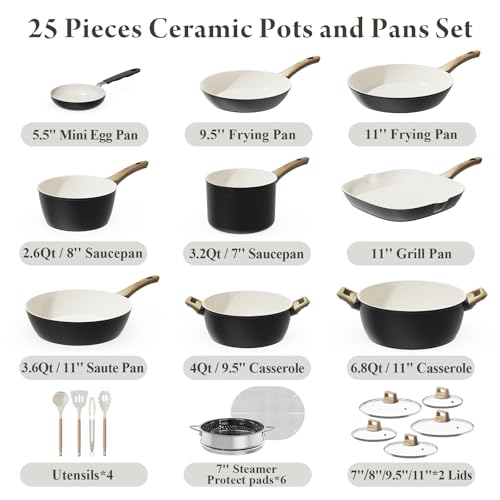 Specification: 25-PC Pots and Pans Set Non Stick Ceramic Cookware Set, Healthy Non Toxic Kitchen Cookware Sets with Large Capacity, Induction Compatible, PFAS/PTFE/PFOA/PFOS Free, Black/White