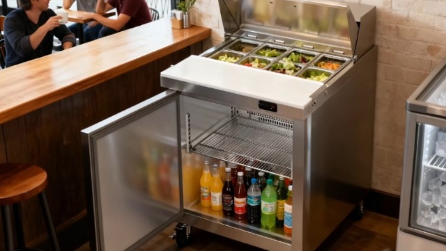 High-Efficiency Air Cooling System: The commercial refrigerator sandwich & salad prep table utilizes an advanced R290 refrigeration system and a powerful compressor to achieve rapid and even cooling within the unit—maintaining an ideal temperature range of 33-41°F, ideal for fresh produce and pre-processed ingredients. The salad prep table refrigerator automatic defrost design effectively prevents frost and ice buildup, completely eliminating the need for manual defrosting