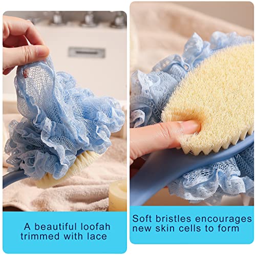 [2nd Generation] Shower Body Brush with Bristles and Loofah,Back Scrubber Bath Mesh Sponge with Curved 16″ Long Non-Slip Handle Skin Exfoliating Massage Suitable for Men and Women (Blue)