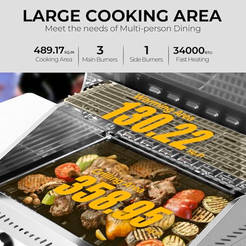 Spacious Cooking Area & Storage : Offers 489.17 sq. in. total grill space (358.95 sq. in. main grilling + 130.22 sq. in. warming area). Built-in bottle opener, side hooks for tools, and bottom storage keep everything organized.