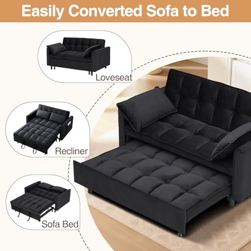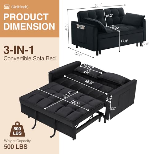 Specification: 3 in 1 Convertible Sleeper Sofa Bed, Modern Velvet Loveseat Pull-Out Couch w/Pullout Bed, Small Love Seat Lounge Sofa w/Reclining Backrest,Toss Pillows, Pockets, for Living Room(Black, 55.1)