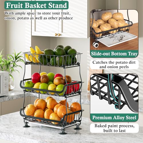 Easy to Snap together: Bid farewell to complicated storage solutions! Our fruit basket stand can be easily stacked together in minutes. The slide-out bottom tray helps you catch the potato dirt and onion peels.