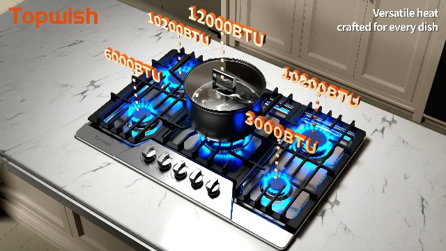 【Dual Fuel Compatibility】Designed for both natural gas and propane (LPG), the Topwish gas stove top comes with all necessary nozzles and regulators for easy conversion (default nozzles are for natural gas). It is ideal for residential kitchens, outdoor cooking stations, RVs, cabins, and mobile homes