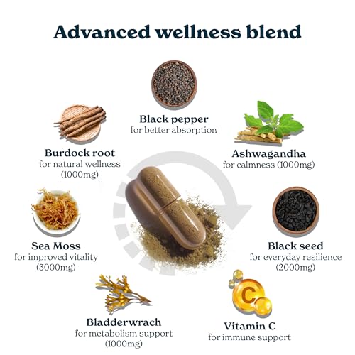 Specification: 3000mg Iris Sea Moss, 2000mg Black Seed Oil, 1000mg Ashwagandha, 1000mg Burdrock Root, 1000 mg Bladderwrack with Black Pepper & Vitamin C | Vitality & Energy Support | All-in-one supplement | 120 Caps