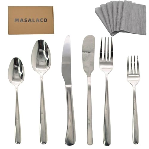 Specification: 36 Piece Silverware Set with Placemat,MASALACO 6-Piece Stainless Steel Cutlery Set-Knife Fork Butter Knife and Spoon,Mirror Finish,Suitable for Home Restaurant Hotel Kitchen Utensils,Dishwasher Safe