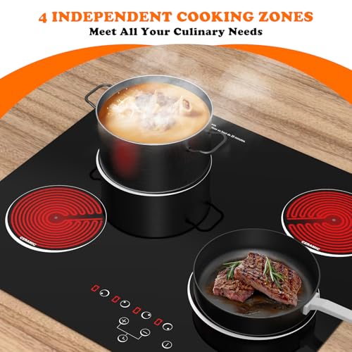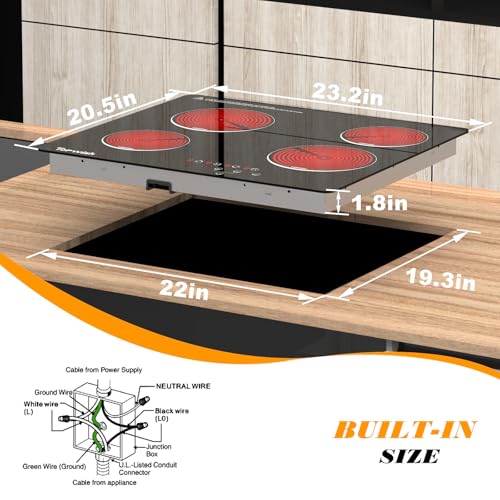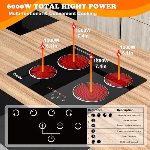 Specification: 4 Burner Electric Cooktop, TOPWISH 24 Inch, Built-in Electric Stove Top, 220-240v Radiant Cooktop with Child Lock, Touch Control, Residual Heat Indicator, Overheat Protection, Hard Wire (No Plug)