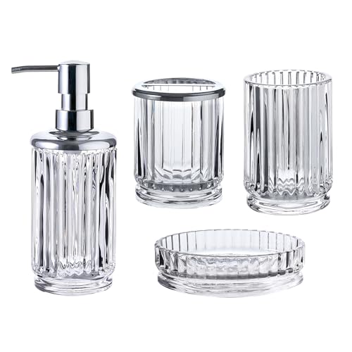 4-Piece Glass Bathroom Accessories Set, Clear Crystal Ribbed Design, Soap Dispenser, Toothbrush Holder, Tumbler, Soap Dish
