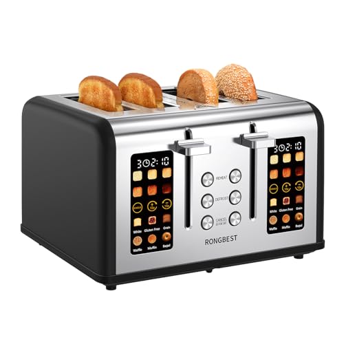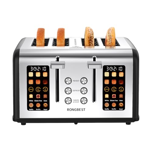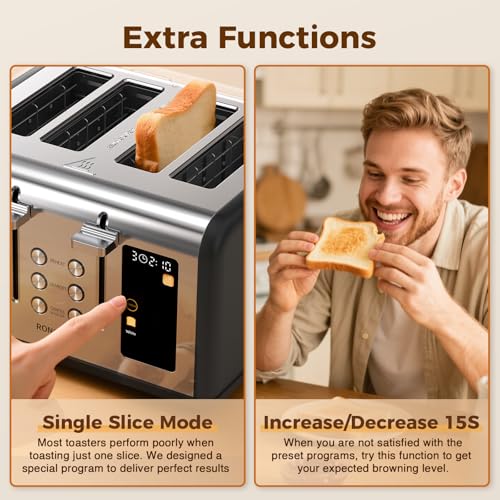 【Dual 4.4” Touch Screens with Independent Controls】: Toast 4 slices at once with full control over each side—6 shade levels and 6 bread types per screen (White, Gluten Free, Grain, Waffle, Muffin, Bagel).