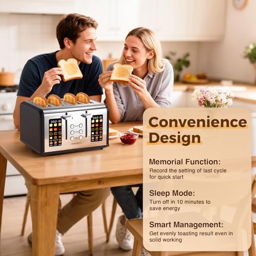 4 Slice Touch Screen Toaster, Stainless Steel Toaster with Wide Slots for Bagels and Bread, Reheat/Defrost/Cancel Functions, Removable Crumb Tray, Matt Black