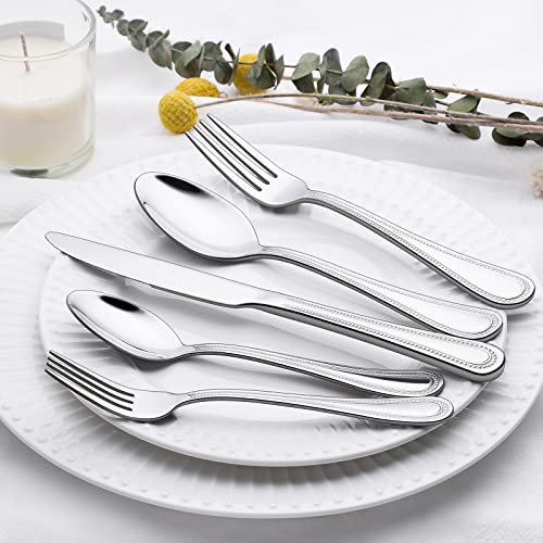 【CLASSIC STYLE WITH BEADED HANDLE DESIGN】 The flatware set features teardrop handles embellished with a beaded border and rounded end. The classic, timeless beaded pattern in the handle border looks like gleaming jewelry, which is gorgeous and can enhance elegance to our table.