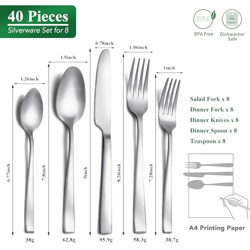 Specification: 40 Piece Silverware Set Service for 8, EIUBUIE Premium Stainless Steel Cutlery Set, Matte Finish Flatware Sets Durable Solid, Modern Kitchen Tableware Eating Utensil Sets Include Spoons Forks Knives