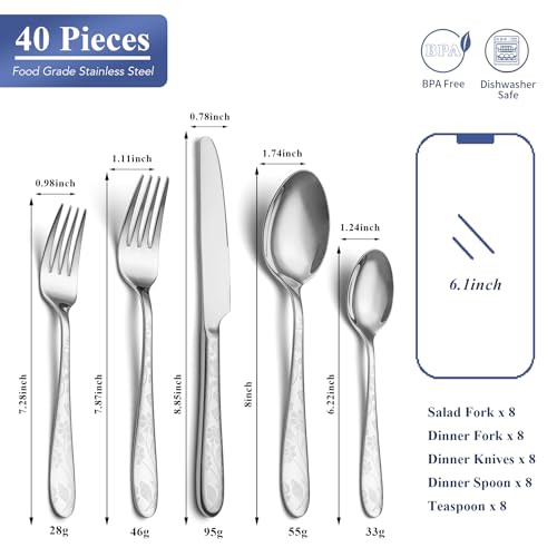Specification: 40 Piece Silverware Set Service for 8, EIUBUIE Premium Stainless Steel Cutlery Set, Mirror Polished Flatware Sets with Pattern Handle, Modern Kitchen Eating Utensils Sets Include Spoons Forks Knives