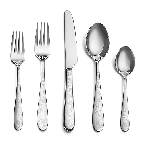 【Unique Silverware Set with Beautiful Pattern Handle】Our flatware set for 8 is designed with beautiful laser prints of flowers, unique styles make your dining table special, standing out from the ordinary tableware, and unique silver finish pattern design brings modern and stylish to the modern silverware set impresses your family and friends when they come round for dinner