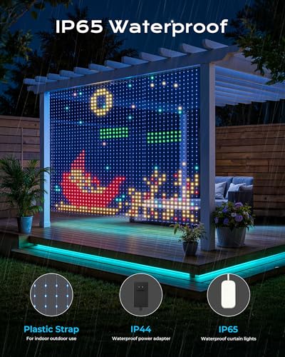 Specification: 400 RGBIC LEDs Smart Curtain Lights with DIY GIF, 6.6×6.6ft Color Changing Holiday Wall Lights with APP, IP65 Waterproof Christmas String Fairy Lights for Indoor Outdoor Bedroom Window
