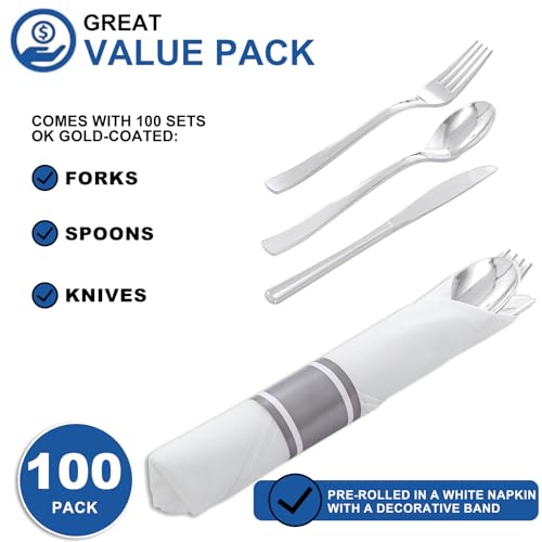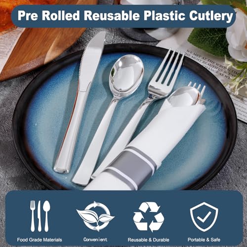 400PCS Pre Rolled Silver Plastic Silverware Sets – Heavy Duty Silver Cutlery – Include 100 Pack Wrapped Disposable Utensils with Napkins for Parties & Dinners & Weddings