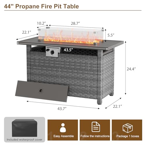 【Dimensions & Packing list】Fire pit table:43.5″ L x 22″ W x 24.4″ H. Packing list: rattan table, metal lid, fire pit pan with gas hose and regulator, wind glass guard, decorative glass rocks and a table cover. All comes in 1 boxes