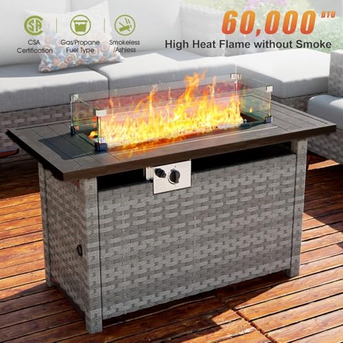 Specification: 44″ Fire Pit Table with Wind Guard for Outdoor, Auto-Ignition Propane Gas Firepits Rattan Rectangular Table for Outside Patio 60,000 BTU, Gray