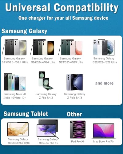 One for All:This 45w charger super fast charging wall charger is compatible with Samsung Galaxy S25/S25 Ultra/ S25+/S24/S24 Ultra/ S24+/S23/S23 Ultra/S23+/S20 Ultra/Z Fold 4/Z Fold 5/Z Flip 4/Z Flip 5/Galaxy Tab S8 S7 /Tab S8 S7 Plus/Tab S8 Ultra/ Galaxy Book3 Ultra/Galaxy Book3 Pro/Galaxy Book3 Pro 360/Galaxy Book3 360/Galaxy Book3/Galaxy Book2 Pro/Galaxy Book2 and 25W Super Fast Charging for Galaxy S21 Ultra/S21 Plus/S21/Note 20 Ultra/Note 20/Note 20 Plus/S20