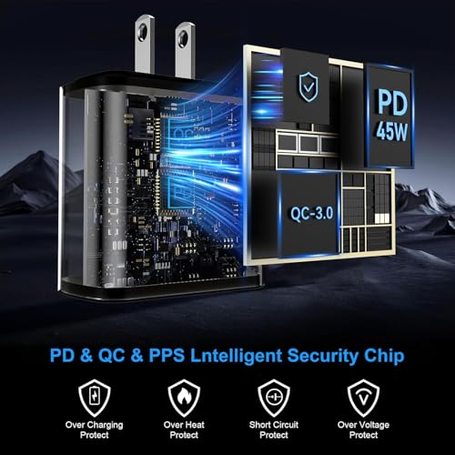 ✅【Safety Efficient Super Fast Charging】 This 45W Charger owns a built-in multi-protection system, avoiding over-voltage, over-charge, over-heat, etc. The UL-Certified 45W USB-C Wall Charger and 6ft USB-C to USB-C Super Fast Charging Cable matches the current required by the device automatically, charge your device fast, safely, and steadily, Maximize the life of your battery.