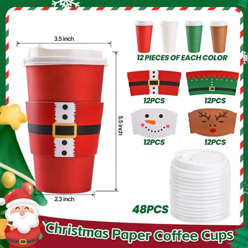 Specification: 48 Pack Christmas Disposable Paper Coffee Cups with Lids and Sleeves, 16 oz, Snowman Santa Elf Designs, Ideal for Home, Office, Travel