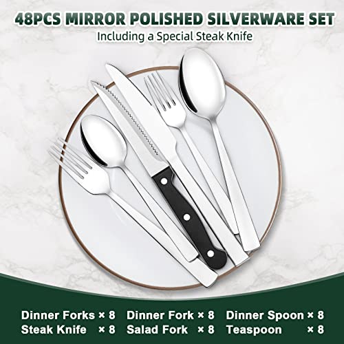 48-Piece Silverware Set, CEKEE Stainless Steel Flatware Set for 8 with Steak Knives, Mirror Polished Kitchen Utensils Set, Tableware Cutlery Set for Home, Dishwasher Safe – Spoons and Forks Set