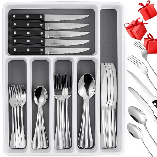Specification: 49 Piece Silverware Set with Organizer – Stainless Steel Cutlery Set for 8, White Elephant Christmas Gifts kitchen Utensil Flatware with Steak Knives, Spoons and Forks, Dishwasher Safe, Rust-proof