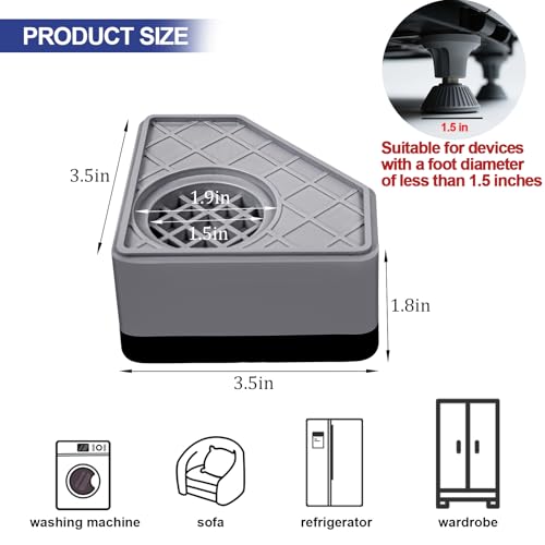 Standard Size: The size of the washing machine pad is 3.5 x3.5 x1.8 inch. The diameter of the hole is 1.5inch, antivibration pads for washing machine are designed to fit all standard washers and dryers. its super durable,good bearing capacity,wear-resistance, moistureproof.Make sure long-term service. Before You Buy: Ensure your washing machine’s feet are no wider than 1.5 inches