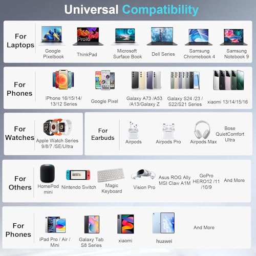 【Universal Compatibility】The 500W USB C charging station supports PD3.0/PPS, QC, PE2.0, AFC, FCP, SCP, fast charging protocols and is compatible with Macbook Pro/Air, Microsoft Surface, Dell XPS,iPhone 17/16/15/14/13/12/XS/XSMax/XR/X/11/ProMax/SE2020/8/7/6/6sPro/Pro Max/Samsung Galaxy S24/S23/S22 Ultra/S21+,Dell XPS 15/13 Google Pixel iPad Pro iPad Mini Series/ iPad Air Series AirPods Pro Steam Deck Game Consoles, Smartwatchs etc.