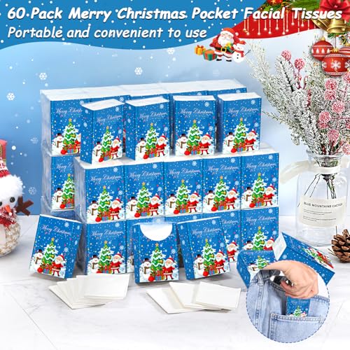 60 Pack Christmas Pocket Tissues 600 Sheets Merry Xmas Travel Packs 3 Ply Unscented Small Mini Individual Portable Travel Tissue Pack with Unique Embossing for Purse Holiday Party Travel