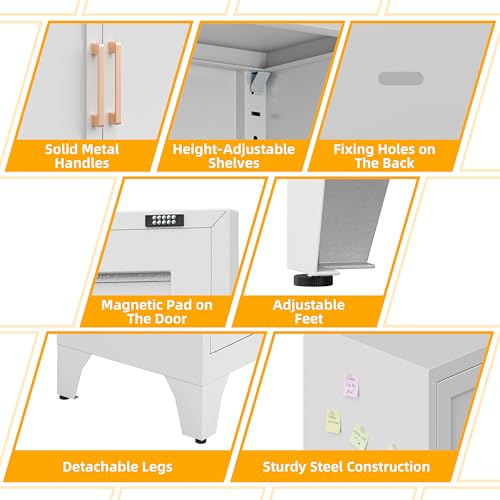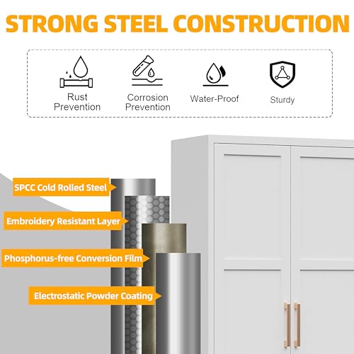 🌠【Sleek Dual-Tone & Gold Accents】White food cabinet with gold metal handles merges modern style with durable steel construction, ideal for kitchens, dining areas, home offices, and laundry rooms—perfect for elevating any decor.